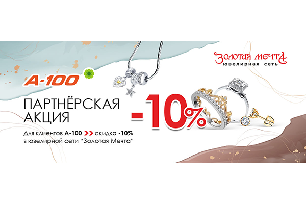 Рады сообщить, что в ювелирной сети «Золотая мечта» действует дополнительная скидка 10% для клиентов А100!
